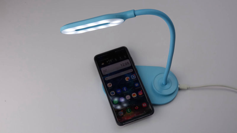 Светодиодная лампа с возможностью быстрой зарядки устройств с поддержкой стандарта QI.